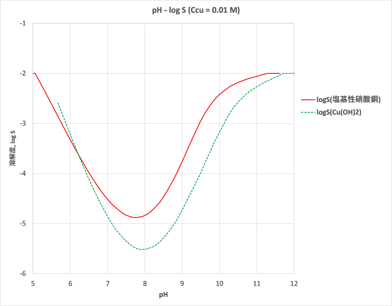 log Cn-log S、pH-log SおよびCn-pHの関係をそれぞれ図-2、図-3、図-4に示します。図中には比較のためCu(OH)2が沈殿するとした場合についても示します(緑色の点線)。
