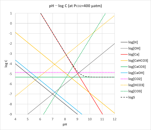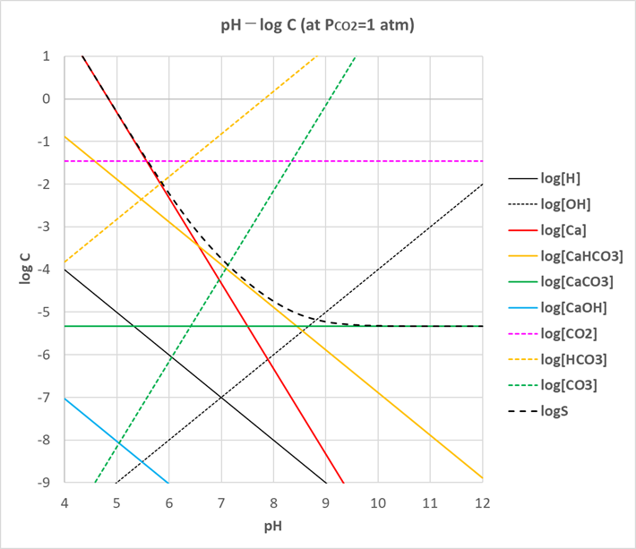 したがって、[CaCO3(aq)]は常に一定、[CO2(aq)]はPCO2の関数、[H], [OH], [CaHCO3]は[H]の関数、[HCO3], [CO3], [Ca], [CaOH]はPCO2および[H]の関数となります。つまり、PCO2を一定にし、酸または塩基を加えてpHをある値に調整すれはすべての化学種濃度が一義的に決まることになります(活量係数は無視して)。