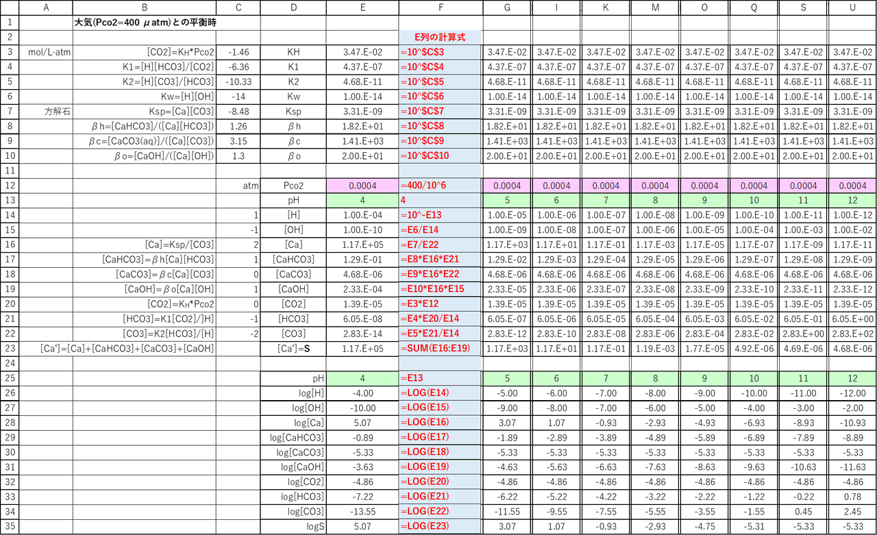 PCO2=400 μatm=4×10^-4 atm(大気中のCO2分圧にほぼ相当)における化学種濃度と溶解度をエクセルで計算します。計算結果の抜粋を図-1に示します。また、pHと化学種濃度・溶解度の関係図(pH-log C)を図-2に示します。PCO2=400μatmの場合、pH9くらいまではCa2+が優勢な化学種であり、およそpH10を過ぎるとCaCO3(aq)が優勢な化学種となります。CaHCO3+の寄与はほとんどありません。CaCO3(aq)はPCO2とpHに無関係なので、CaCO3(aq)が優勢な領域(pH≳10)においては、溶解度Sはほぼ一定(∼5×10^-6 mol/L)となります。