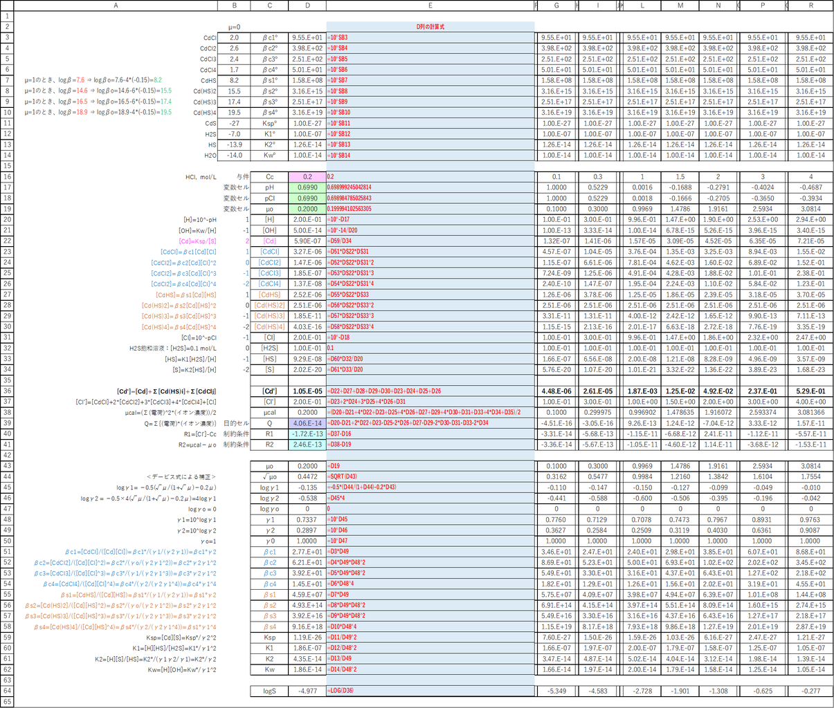 μoに適切な初期値を与え、ソルバーを実行して、CdSの溶解度[Cd’](=S)を求めます。