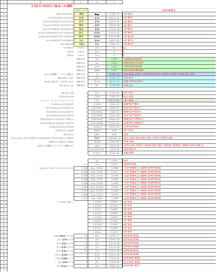 [Fe']は[Fe]に関する3次関数となり、[Fe']=[Fe]αの関係式を用いることができない。このような場合、エクセルのソルバー機能の使用が有効である。
