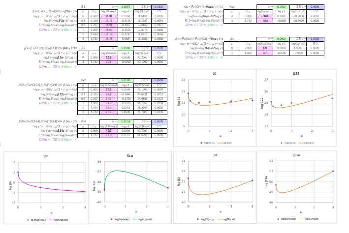 各平衡定数について、モデル式のk'に初期値を与えて求めたlogβ(cal)と実験値のlogβ(exp)(図-1)との偏差平方和(∑E^2)を求め、この偏差平方和が最も小さくなるようなk'値をエクセルのソルバーによって求めます。