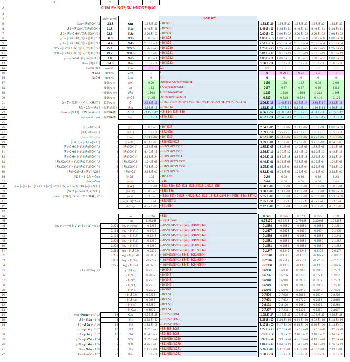 CFe=0.1 mol/L硝酸鉄(III)水溶液にCno mol/LのHNO3を加えたときの化学種濃度を、エクセルのソルバー機能を用いて求めます。HNO3の添加によって体積は変化しないものとします。ソルバーの操作方法は、上記とほぼ同じです。異なる点だけを以下に記します。