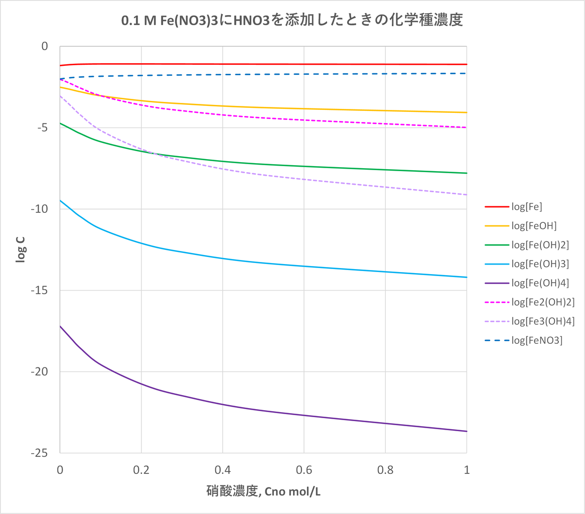 硝酸鉄(III)水溶液にHNO3を加えたときの化学種濃度