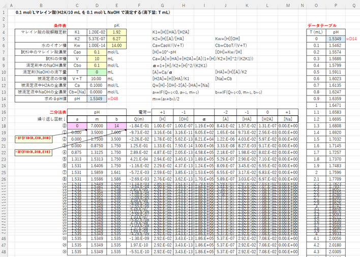 なお、二分法を用いて2価の酸の理論的滴定曲線を作成する方法は、1価の酸の場合と基本的に同じなので、前回作成した1価の酸のエクセルシートを一部修正して作成することも可能です。また、上記の条件表の数値およびデータテーブルのT値を変えるだけで、様々な2価酸の種類・濃度に応じた滴定曲線をグラフに描くことができます。