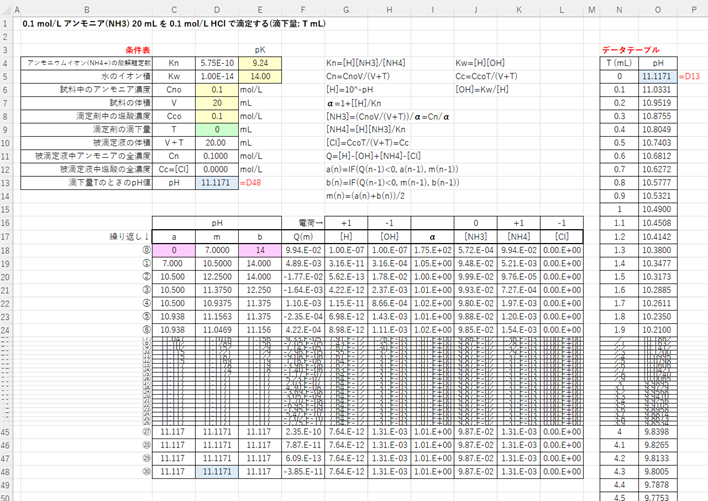 ・J18=$D$11/I18 {[NH3]=Cn/α}
