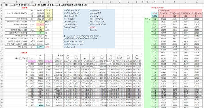 (4) 初回(21行目): pHの初期値a0, b0をC21, E21に入れ、m0の計算式をD21に入れる。