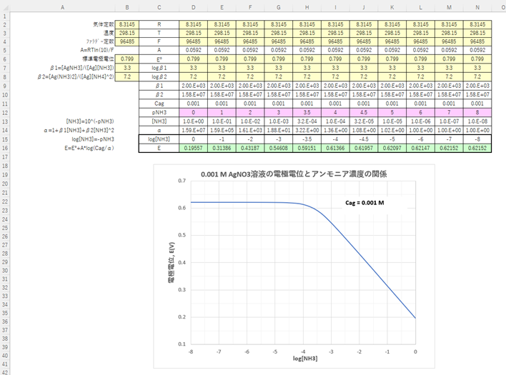 となります(pHは十分高く、Agの水酸化物錯体およびNH4+は無視できるものとする)。