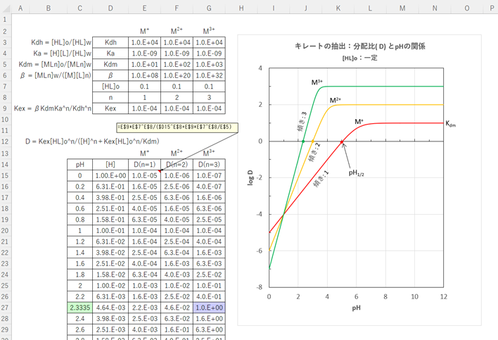金属イオンM+, M2+, M3+ のキレートについて、仮想的な定数値(図-1中に記載)と⑧式を用いてDを計算しました。pHとlog Dの関係を図-1に示します。図-1から分かるように、pHが低い領域において金属イオンM+, M2+, M3+のlogDの傾きはそれぞれ+1, +2, +3の直線となり、pHが高い領域においてはlog D = log Kdmの水平線となります。また、この条件においてM+, M2+, M3+ のpH1/2はそれぞれ5.0, 3.0, 2.3となりました(ソルバー使用)。