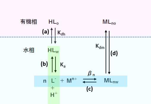 有機相に溶解したキレート剤HLと水相の金属イオンMn+が反応し、無電荷のキレートMLnを生成して有機溶媒に抽出される平衡について考えます。