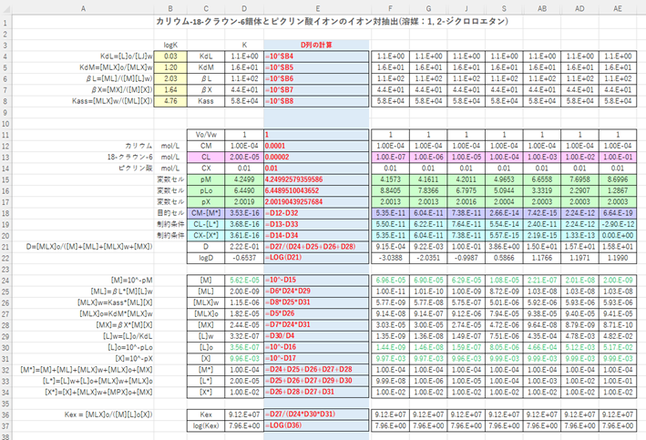 カリウムイオンに関する分配比Dは、試薬(18-クラウン-6、ピクリン酸イオン)濃度の関数になります。18-クラウン-6濃度あるいはピクリン酸濃度を変化させて、Dと試薬濃度との関係を求めました。計算には、エクセルのソルバー機能を用いました(*3)。
