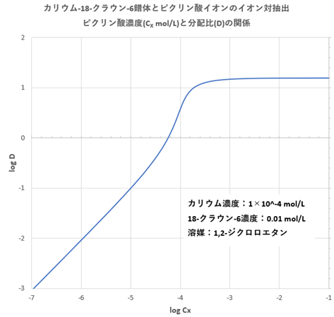 = 0.01mol/Lとした場合についてピクリン酸濃度を変化させて([CX]=10^-7~10^-1 mol/L)、前述と同様にしてDのソルバー解を求めました。log CXと抽出率%の関係を図-4に示します。