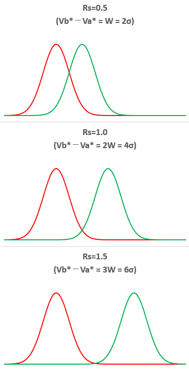 Va*とVb*が非常に近く、σa=σb=σとすると、分離度は次式で与えられます。