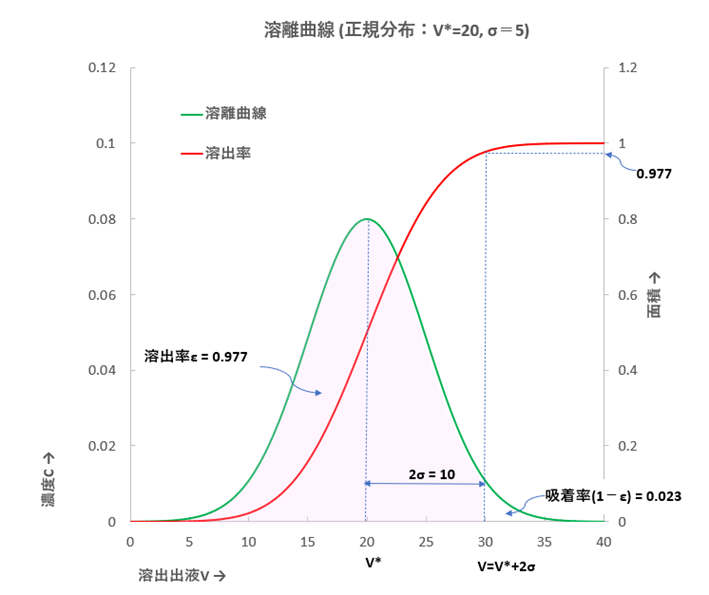図-2において、溶離曲線(緑線)および面積割合の曲線(赤線)は、μ= V* =20, σ= 5 とすると、