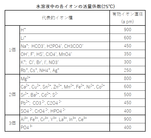 これらの式においてA, Bは定数で、25℃の水溶液においてはそれぞれA=0.51, B=3.3×10^-3です。zはイオンの電荷、aは水和イオンの有効直径(pm)です。
