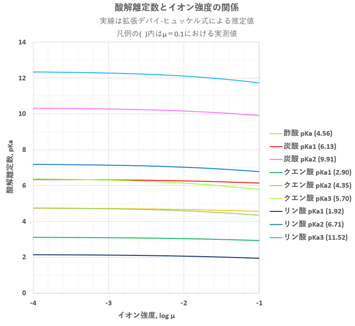 酸解離定数に対する活量係数(イオン強度)の影響は、希薄溶液ではあまり大きくありません。しかし、μ=0.001~0.01を超えると、求められる誤差の精度によっては補正式による補正が必要となります。イオン強度の影響の程度は、Ka1, Ka2, Ka3の順に大きくなります。
