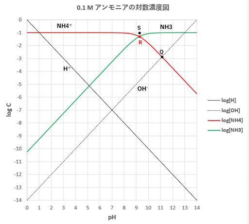 上記の例題1について、答えを対数濃度図で求めます。作成した対数濃度図を図-2に示します。図中の点QからpHを求めます。