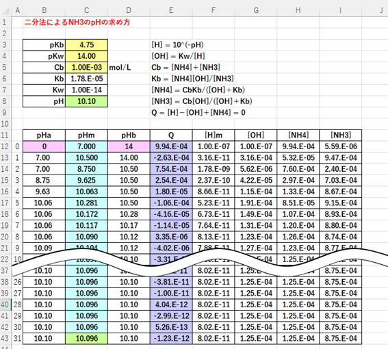 以上、ケース分けにより近似式(b), (c), (d)式を用いて[OH]を計算すると、[H]=Kw/[OH]からpHを求めることができます。近似式を用いることができない場合は、二分法やソルバー等を利用して解く必要があります。これらの取り扱い方法は弱酸の場合と同じです(2022-10-09)。