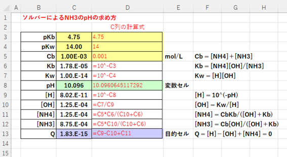 上記の例題2について、答えをソルバーで求めます。[目的セル]をQ=0, [変数セル]をpHとしたときのソルバー解を図-5に示します。