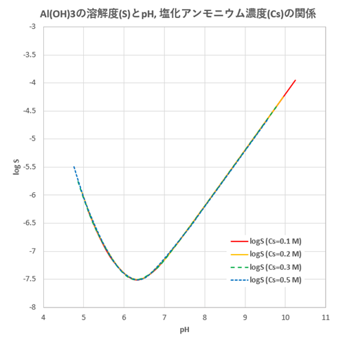 NH4ClおよびNH3を含む溶液に対するAl(OH)3の溶解度(log S)とpHの関係を図-2に示します。Al(OH)3の溶解度はNH4Cl濃度に関係なくpHのみの関数であることが分かります。Fe3+, Cr3+の溶解度も同様です。