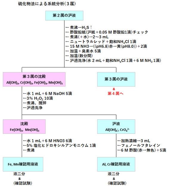 今回は、前回(2023-02-05)の続きで分属におけるNH4Clの効果について調べます。また属内分離について説明します。分属後の分離確認操作では、第3属の沈殿にNaOHとH2O2を加えて煮沸し、Al(OH)3はアルミン酸イオンとして, Cr(OH)3は酸化してクロム酸イオンとして溶解し確認します。沪過洗浄後、残った沈殿は硝酸と塩化ヒドロキシルアンモニウムを加えて煮沸し、Fe(OH)3はFe3+として, Mn(OH)nはMn2+として溶解し確認します。