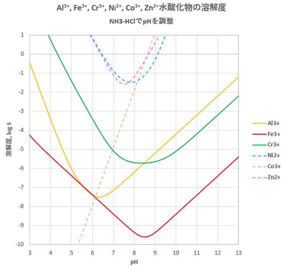 図-1(前回(2023-02-05)図-6の再録)で分かるようにNH3を加えてAl3+, Fe3+, Cr3+の水酸化物を作るためにはpHを適切な範囲に保つ必要があります。他のイオンが沈殿せずにAl3+, Fe3+, Cr3+の水酸化物が沈殿する適切なpH域は8.0~9.5程度と考えられます。添加するNH3量が多少前後しても適切なpHが保たれるよう、NH4Cl-NH3緩衝系をうまく利用する必要があります。またNi2+, Zn2+, Co3+のようにアンミン錯体の形成により溶液に残したいイオンについてはpHとアンモニア濃度の調節が重要となります。