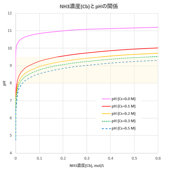 また、NH3の添加濃度(Cb)とpHの関係を図-3に示します。一定のNH4Clを加えることによってpH8.0~9.5付近のCbの許容幅が大きくなっていることが分かります。