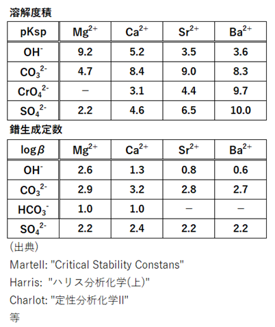 アルカリ土類金属イオンおよびマグネシウムイオンをM2+とすると、MCO3の溶解度積および関連する錯生成定数は次にようになります。