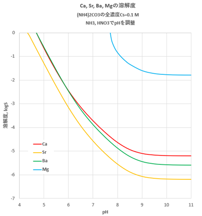 図-5から明らかなように、pHがおよそ8以上になるとCaCO3, SrCO3, BaCO3がほぼ定量的に沈殿することが分かります(S<10^-4 (mol/L))。またこのときMgCO3の溶解度は、例えばpH=8, 9, 10のときそれぞれS=0.15, 0.025, 0.017