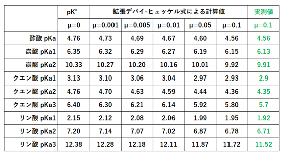 酢酸、炭酸、クエン酸、リン酸について拡張デバイ-ヒュッケル式を用いて特定のイオン強度における濃度平衡定数値(pK)を計算した結果を図-3に示します。図にはイオン強度μ=0.1における実測値も併記しました。拡張デバイ-ヒュッケル式による計算値と実測値は良く一致しています。