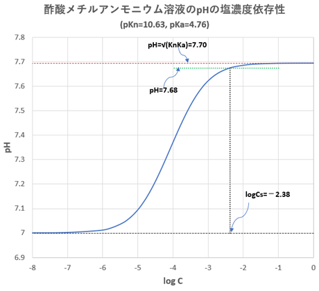 酢酸メチルアンモニウムについて塩濃度log CsとpHの関係を図-5に示します。Csが非常に大きくなるとpHは[H]=√(KnKa)つまりpH=(pKa+pKn)/2=7.70に近づきます。またCsが非常に小さくなるとpHは7.00に近づきます。pHの許容差を0.02としたときのCsはエクセルで計算すると0.004 mol/L (log Cs=-2.4)となります。つまりCsが0.004 mol/L以上であれば近似式[H]=√(KnKa)を用いることができると言えます。