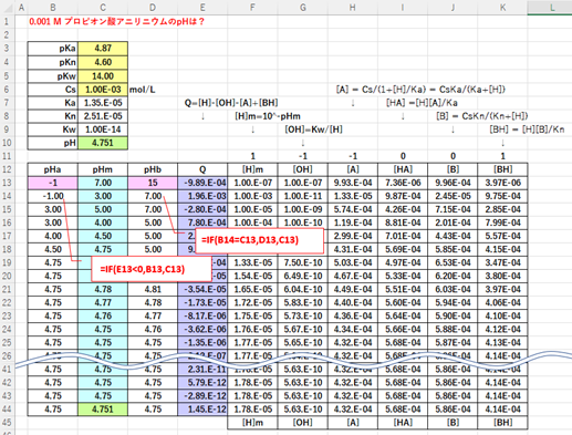 pKn, pKw, Csの値を入力し(C3~C6)、Ka, Kn, Kwを計算する(C7~C9)。(Ka, Kn,