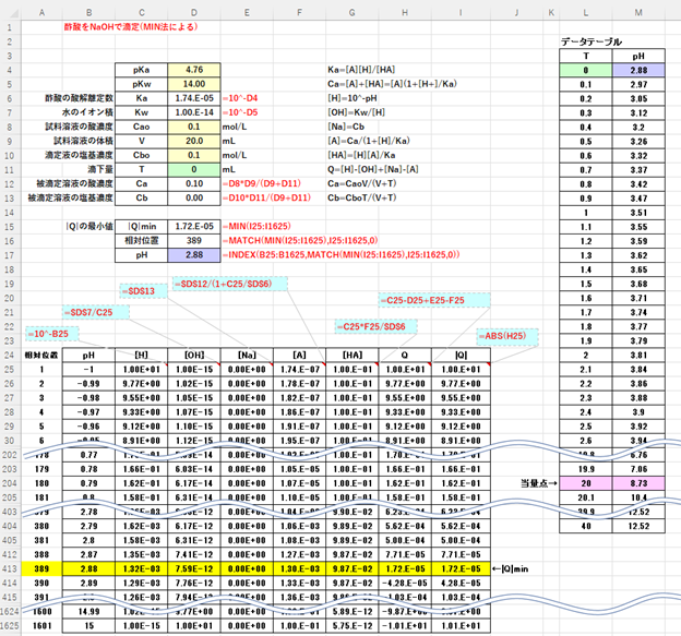 (*2) 統計関数であるMIN関数でabs(Q)の最小値を求め、検索/行列関数のMATCH関数でその最小値の相対的位置(上から何番目)を求め、INDEX関数でその位置のpHの値を求める。