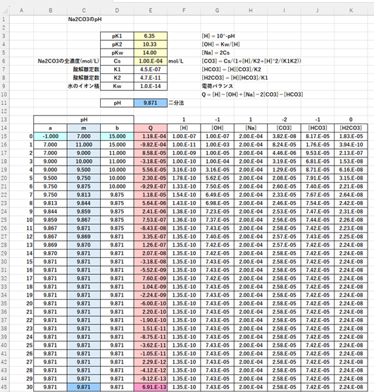 として、Q=0となるpHをエクセルのソルバー機能で求める。