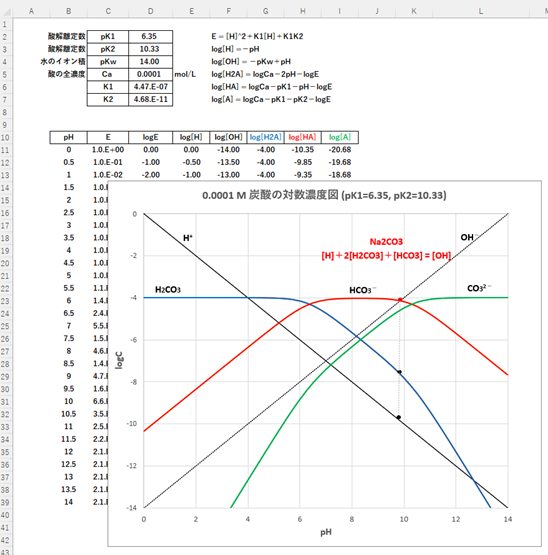 (*1) 炭酸イオン: [CO3]=Cs/(1+[H]/K2+[H]^2/K1K2)=CsK1K2/(K1K2+K1[H]+[H]^2)