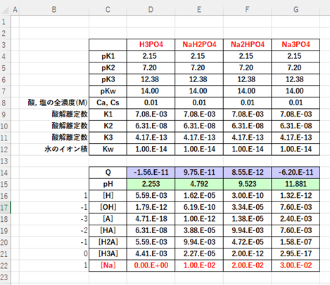 リン酸およびその塩溶液のpHについて、エクセルを利用して二分法やソルバー法で解くこともできます。例として、それぞれ0.01 mol/LのH3PO4, NaH2PO4,