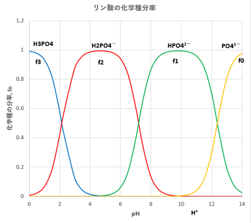 リン酸に関する4つの化学種(PO43-, HPO42-, H2PO4-, H3PO4)について、それぞれの化学種濃度の全酸濃度Caに対する割合を化学種分率(fn)と定義します(添え字nはその化学種が供与可能なプロトンの数を示す)。