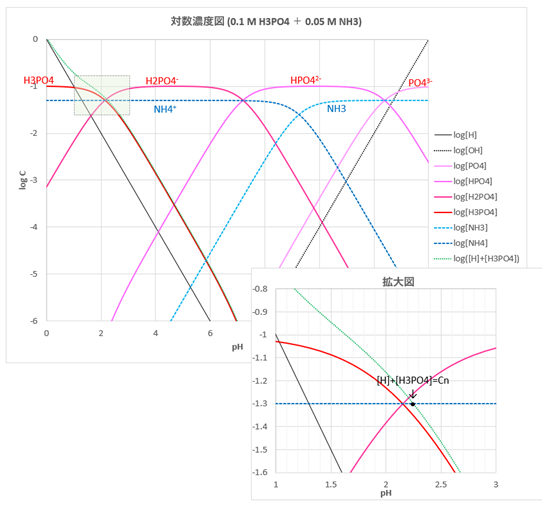 (1) Ca=0.1 mol/L, Cn=0.05 mol/Lのときの対数濃度図を図-4に示す。求めるpHはlog([H]+[H3PO4])とlogCnの交点となる(pH≒2.2)。(*1)