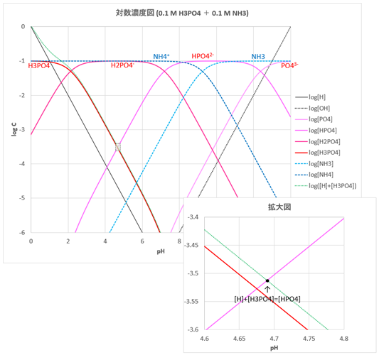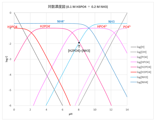 リン酸とアンモニアの対数濃度図を作成し、図上で電荷バランスやプロトン条件を満足させる点を探すことにより、混合溶液のpHを求めることができます。