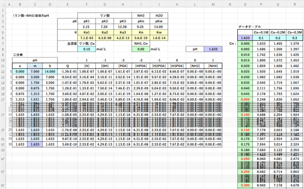 様々なCa, Cnに対して、目的セルをQ(→0), 変数セルをpHとして、エクセルのソルバー法を実施すれば混合溶液のpHを求めることができます。
