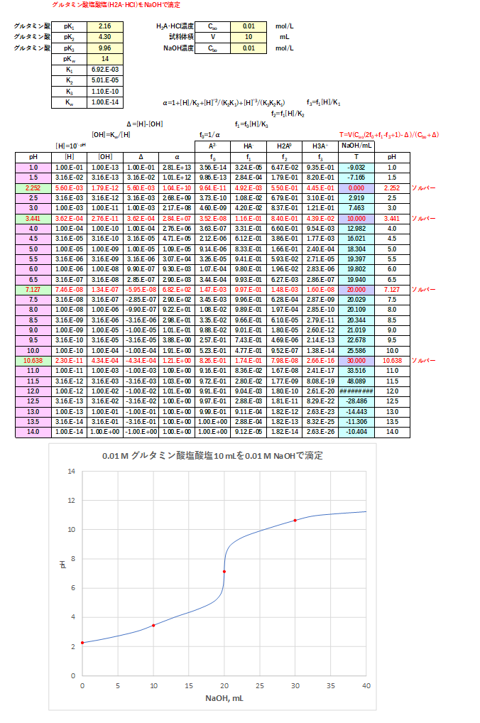 0.01 mol/Lのグルタミン酸・塩酸塩10 mLを0.01 mol/LのNaOHで滴定したときのエクセルによる計算結果と滴定曲線を図-2に示します(pK1=2.16, pK2=4.30, pK3=9.96)。
