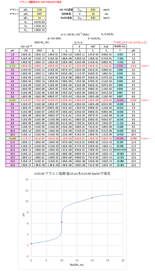 0.01 mol/Lのアラニン・塩酸塩10 mLを0.01 mol/LのNaOHで滴定したときのエクセルによる計算結果と滴定曲線を図-1に示します(pK1=2.34, pK2=9.87)。