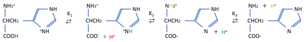 ジアミノ-モノカルボン酸の一種であるヒスチジンは次のように解離します。