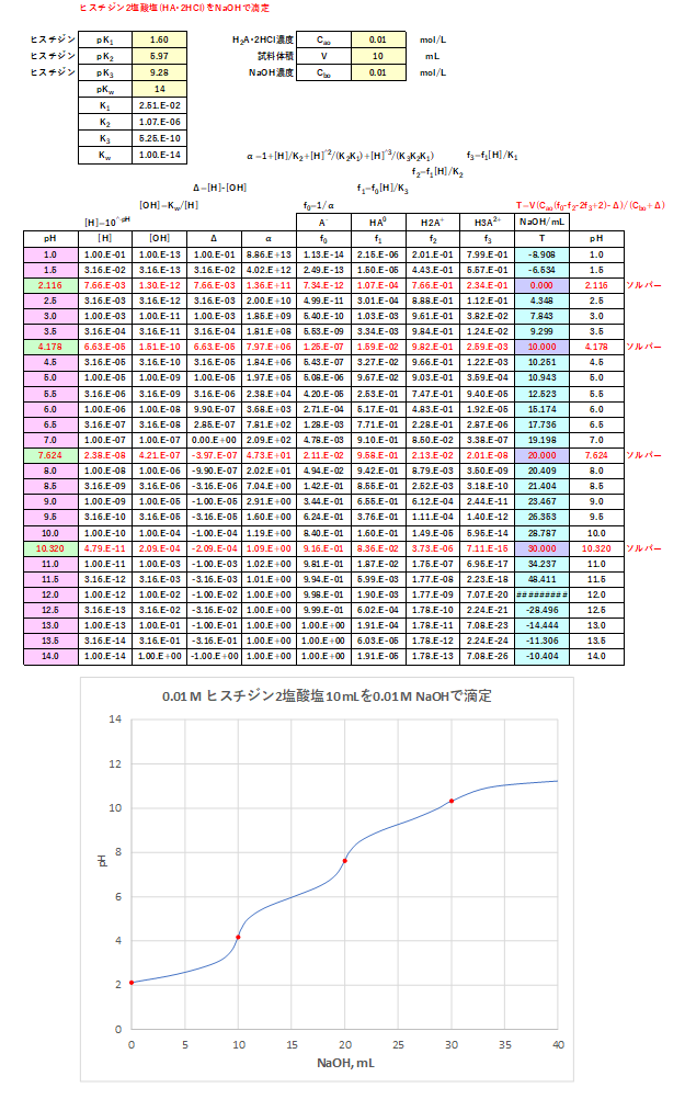 0.01 mol/Lのヒスチジン・2塩酸塩10 mLを0.01 mol/LのNaOHで滴定したときのエクセルによる計算結果と滴定曲線を図-3に示します(pK1=1.6, pK2=5.97, pK3=9.28)。