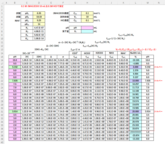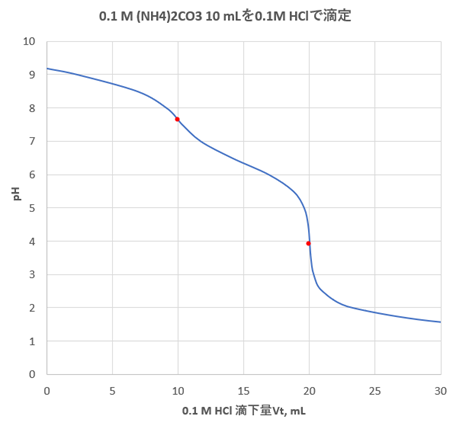例題1 0.1 mol/L 炭酸アンモニウム((NH4)2CO3)溶液10 mLを0.1 mol/L HClによって滴定するときの滴定曲線をレビ法により描け。炭酸の酸解離定数をpKa1=6.35, pKa2=10.33、アンモニウムイオンの酸解離定数をpKn=9.25とする。