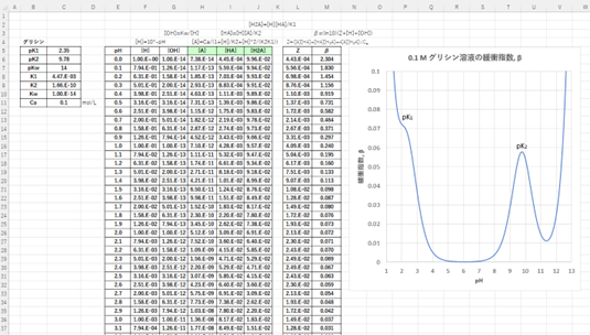 たとえば、0.1 mol/Lのグリシン(pK1=2.35, pK2=9.78)の緩衝指数を図-4に示します。