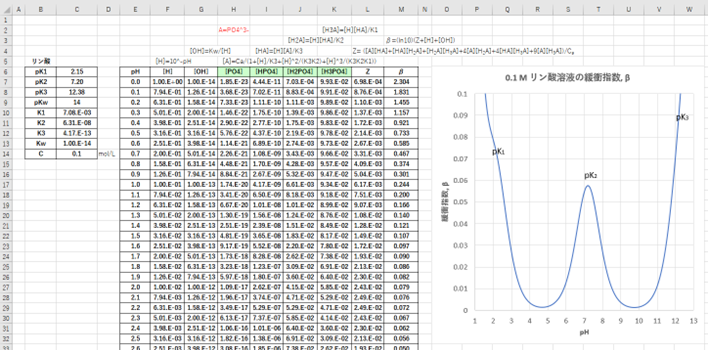 トリプロトン酸の緩衝指数についても、ジプロトン酸の場合と同様のやり方で式を導くことができます。トリプロトン酸の緩衝指数(β):
