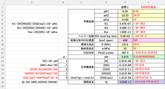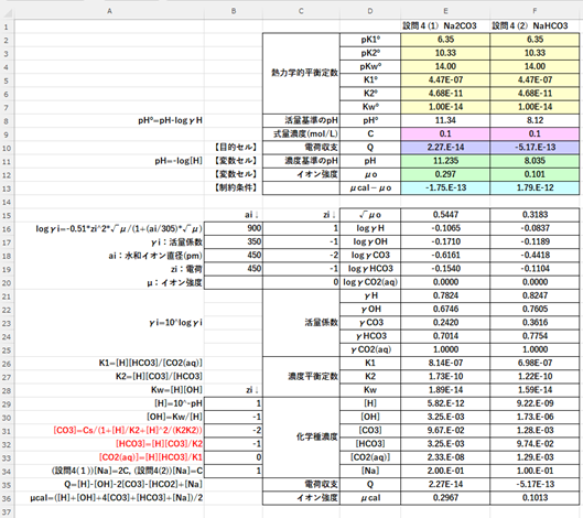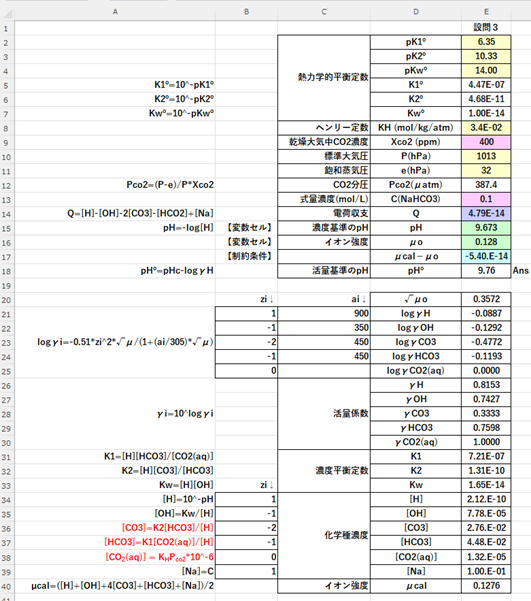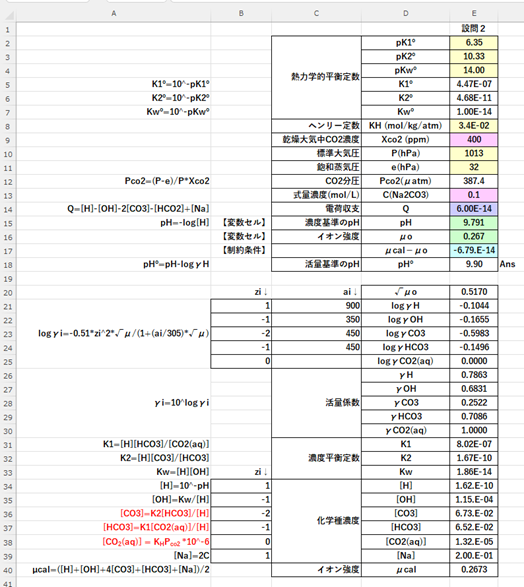 これらの関係式から、ソルバーを用いて、Caを変化させてpHºを求める。