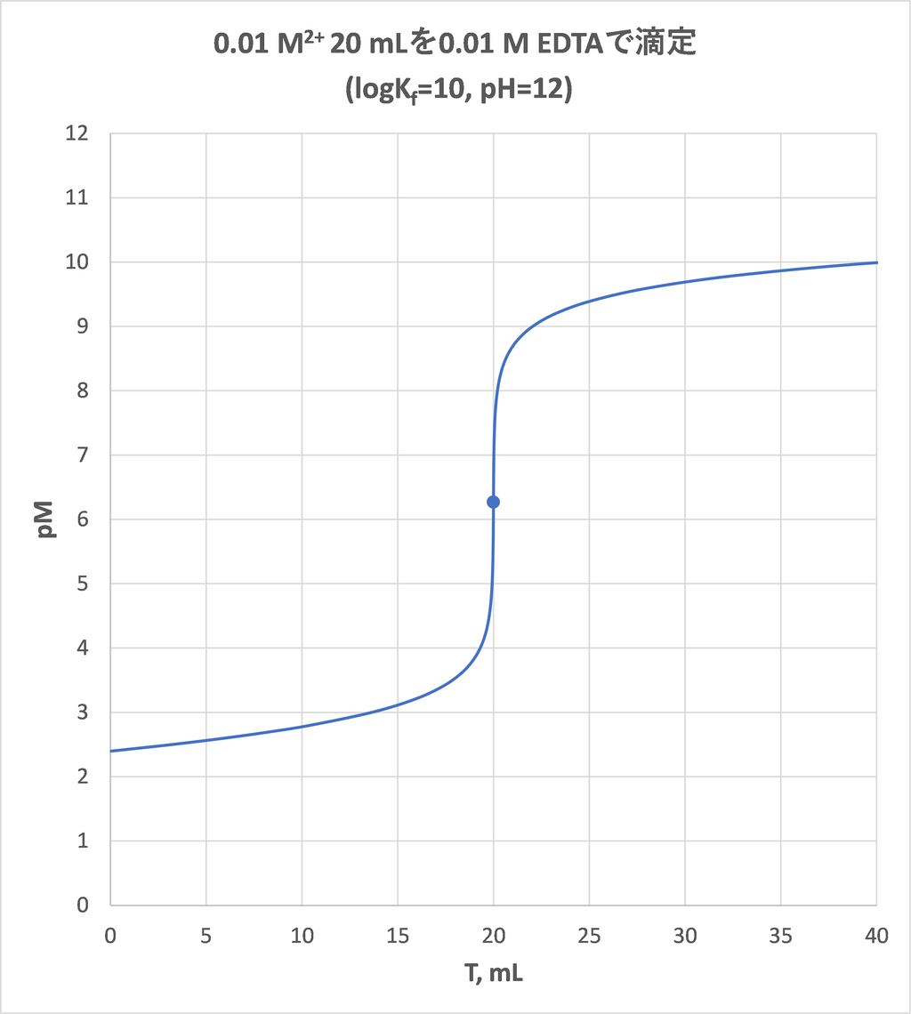 pMの値を与えると[M]=10-pMからTを求めることができ、滴定曲線(T-pM)を描くことができます。