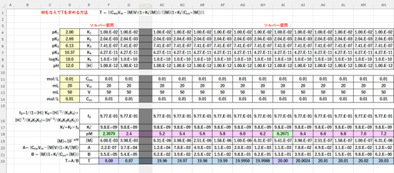また、場合によっては多核錯体が生成する可能性もあります。このような複雑な平衡を解析するときは上記の関係式(⑩または⑫)では不十分であり、エクセルのソルバーの使用が有効となります。